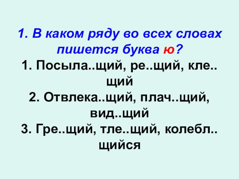 Слайд 41. В каком ряду во всех словах пишется буква ю?