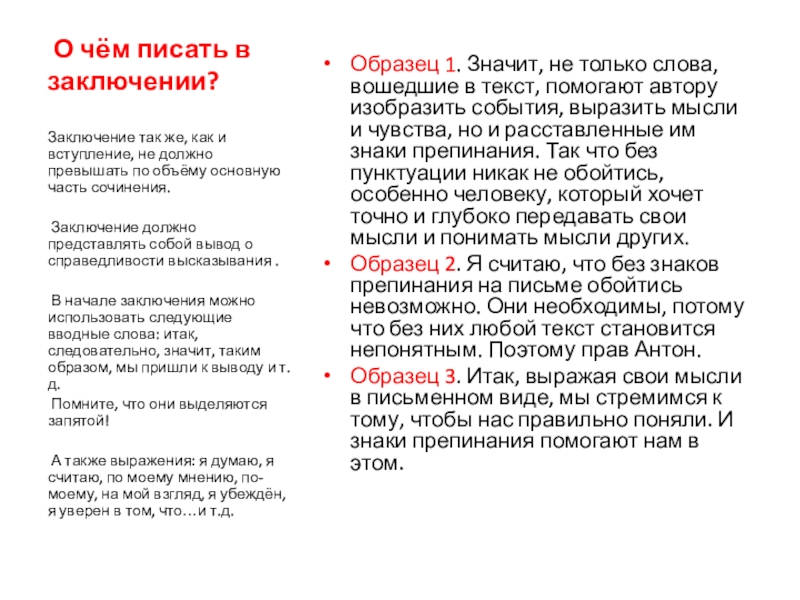 Заключение так же, как и вступление, не должно превышать по объёму основную часть сочинения.