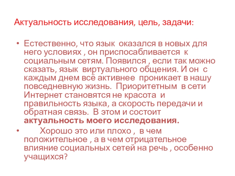условиях , он приспосабливается к социальным сетям. Появился , если так можно сказать, язык виртуального общения. И он с каждым днем всё активнее проникает в нашу повседневную жизнь. Приоритетным в сети Интернет становятся не красота и правильность языка, а скорость передачи и обратная связь. В этом и состоит актуальность моего исследования.