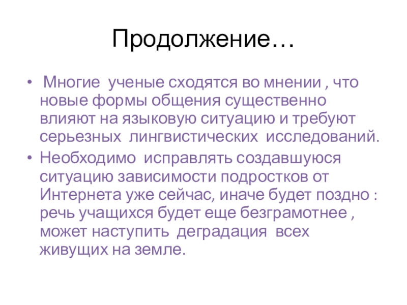 Необходимо исправлять создавшуюся ситуацию зависимости подростков от Интернета уже сейчас, иначе будет поздно : речь учащихся будет еще безграмотнее , может наступить деградация всех живущих на земле.
