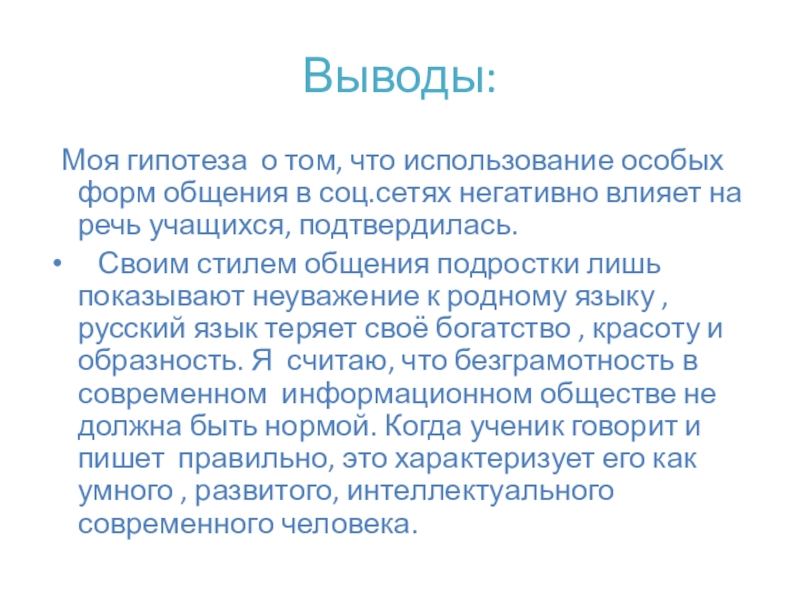 Своим стилем общения подростки лишь показывают неуважение к родному языку , русский язык теряет своё богатство , красоту и образность. Я считаю, что безграмотность в современном информационном обществе не должна быть нормой. Когда ученик говорит и пишет правильно, это характеризует его как умного , развитого, интеллектуального современного человека.
