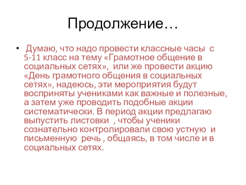 тему «Грамотное общение в социальных сетях», или же провести акцию «День грамотного общения в социальных сетях», надеюсь, эти мероприятия будут восприняты учениками как важные и полезные, а затем уже проводить подобные акции систематически. В период акции предлагаю выпустить листовки , чтобы ученики сознательно контролировали свою устную и письменную речь , общаясь, в том числе и в социальных сетях.