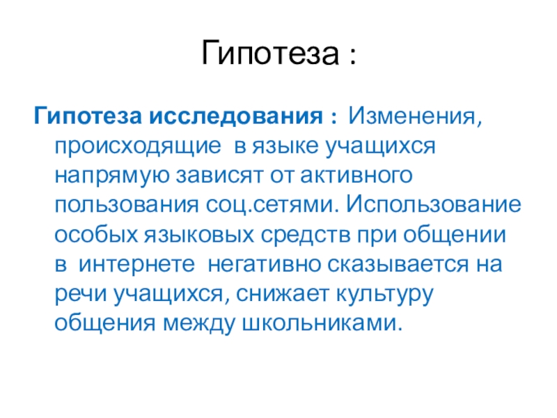 Гипотеза исследования : Изменения, происходящие в языке учащихся напрямую зависят