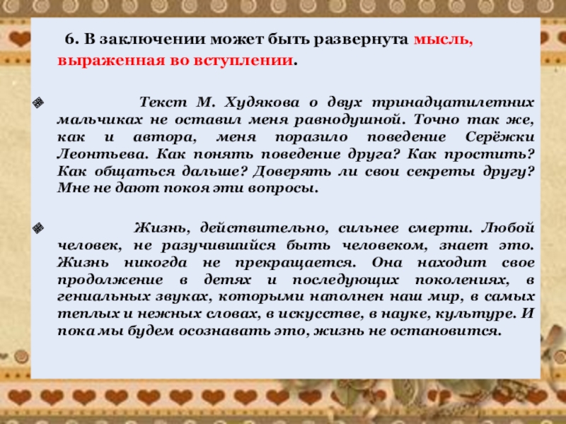 Слайд 8 6. В заключении может быть развернута мысль, выраженная во вступлении.