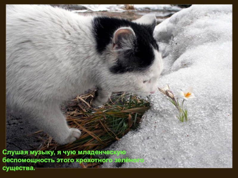 Слайд 11Слушая музыку, я чую младенческую беспомощность этого крохотного зелёного существа.