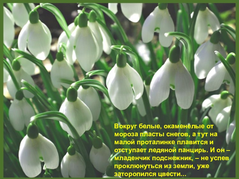 Слайд 13Вокруг белые, окаменелые от мороза пласты снегов, а тут на малой