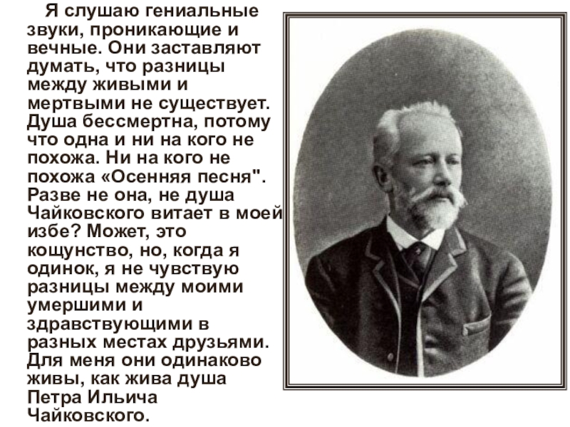 вечные. Они заставляют думать, что разницы между живыми и мертвыми не существует. Душа бессмертна, потому что одна и ни на кого не похожа. Ни на кого не похожа «Осенняя песня". Разве не она, не душа Чайковского витает в моей избе? Может, это кощунство, но, когда я одинок, я не чувствую разницы между моими умершими и здравствующими в разных местах друзьями. Для меня они одинаково живы, как жива душа Петра Ильича Чайковского.