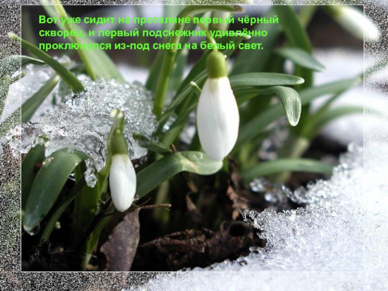 Слайд 10Вот уже сидит на проталине первый чёрный скворец, и первый подснежник