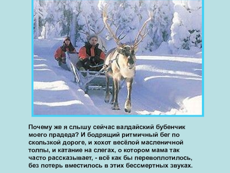 Слайд 6Почему же я слышу сейчас валдайский бубенчик моего прадеда? И бодрящий