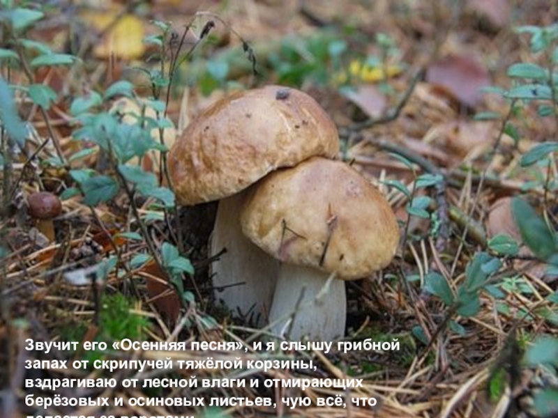 Слайд 5Звучит его «Осенняя песня», и я слышу грибной запах от скрипучей