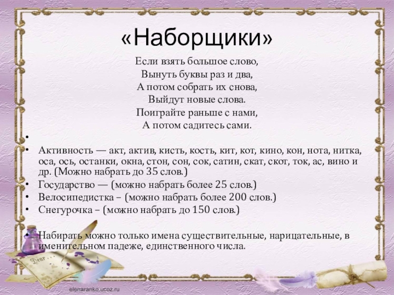 Набирать можно только имена существительные, нарицательные, в именительном падеже, единственного числа.