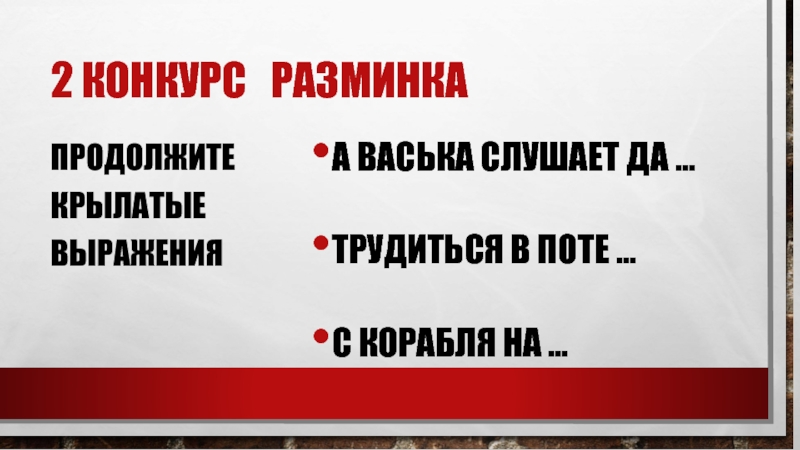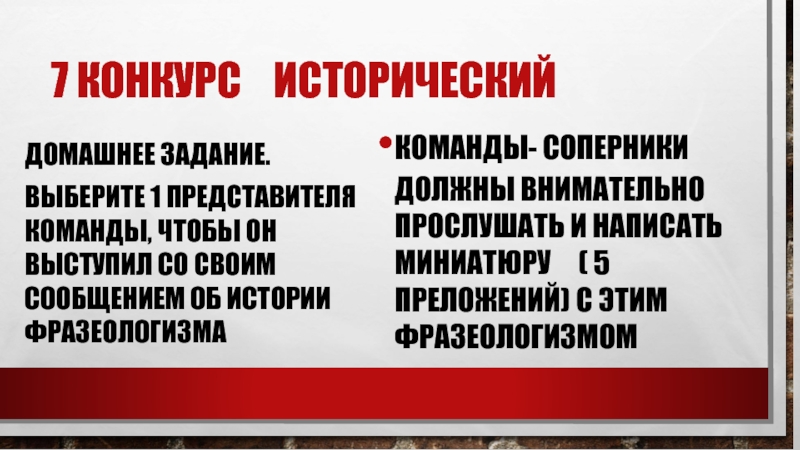 КОМАНДЫ- СОПЕРНИКИ ДОЛЖНЫ ВНИМАТЕЛЬНО ПРОСЛУШАТЬ И НАПИСАТЬ МИНИАТЮРУ ( 5 ПРЕЛОЖЕНИЙ) С ЭТИМ ФРАЗЕОЛОГИЗМОМ