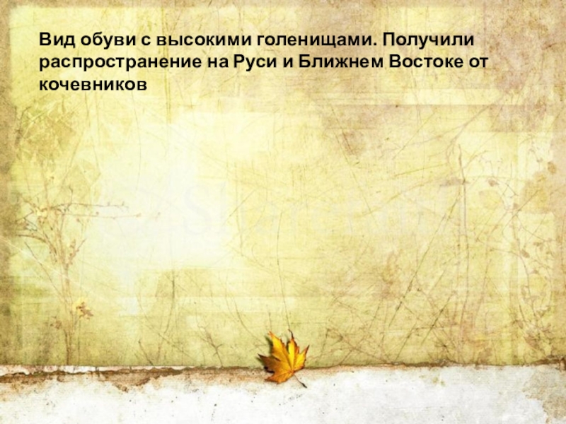 Слайд 27Вид обуви с высокими голенищами. Получили распространение на Руси и Ближнем