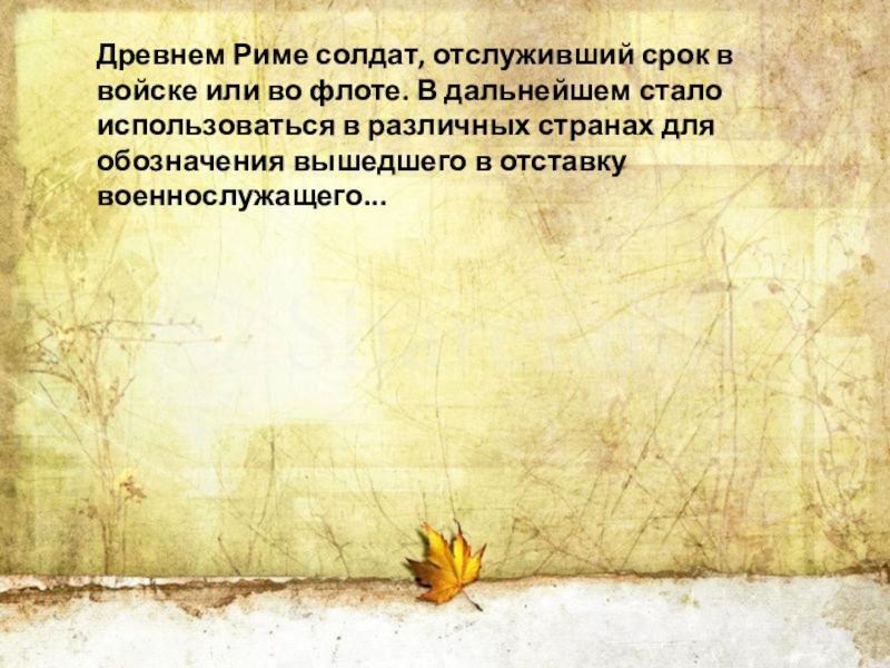 Слайд 7Древнем Риме солдат, отслуживший срок в войске или во флоте. В