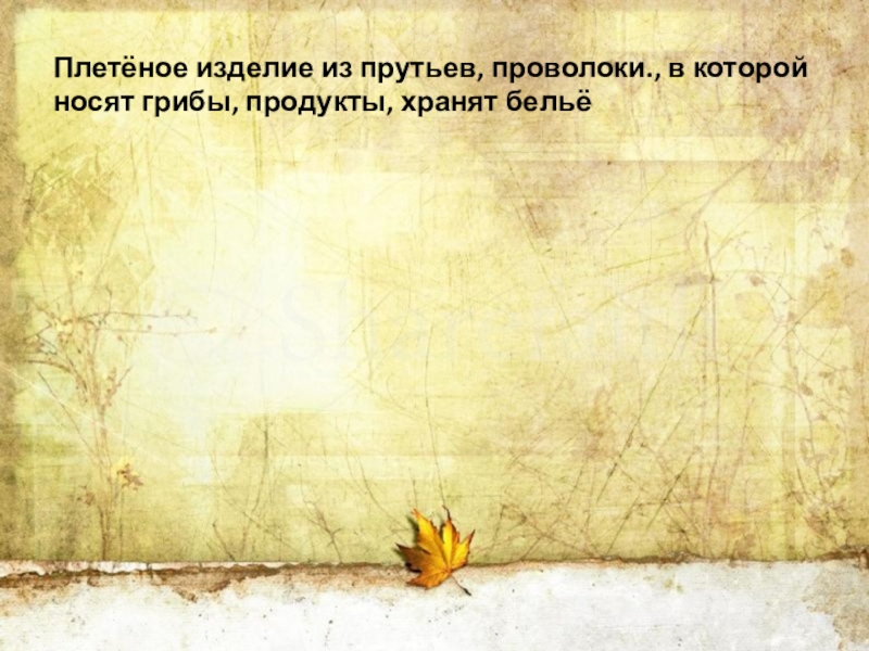 Слайд 3Плетёное изделие из прутьев, проволоки., в которой носят грибы, продукты, хранят
