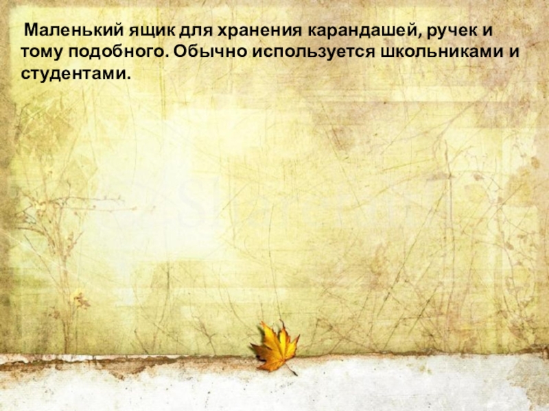 Слайд 19 Маленький ящик для хранения карандашей, ручек и тому подобного. Обычно