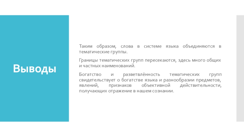 Богатство и разветвлённость тематических групп свидетельствует о богатстве языка и разнообразии предметов, явлений, признаков объективной действительности, получающих отражение в нашем сознании.
