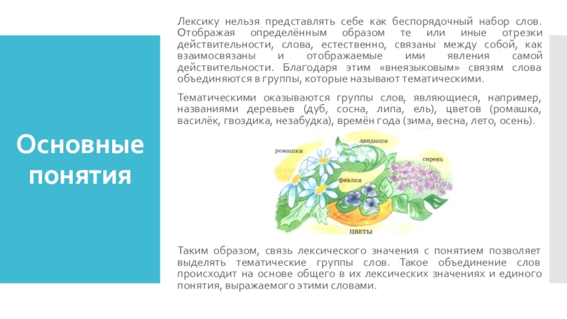 образом те или иные отрезки действительности, слова, естественно, связаны между собой, как взаимосвязаны и отображаемые ими явления самой действительности. Благодаря этим «внеязыковым» связям слова объединяются в группы, которые называют тематическими.