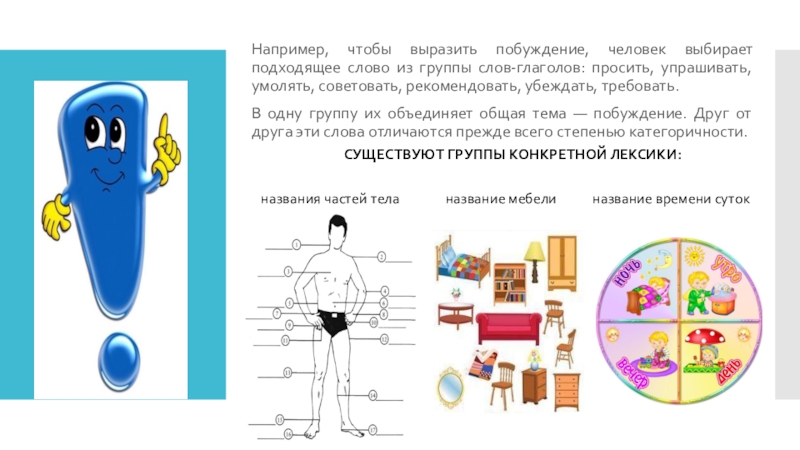 Слайд 8Например, чтобы выразить побуждение, человек выбирает подходящее слово из группы слов-глаголов: