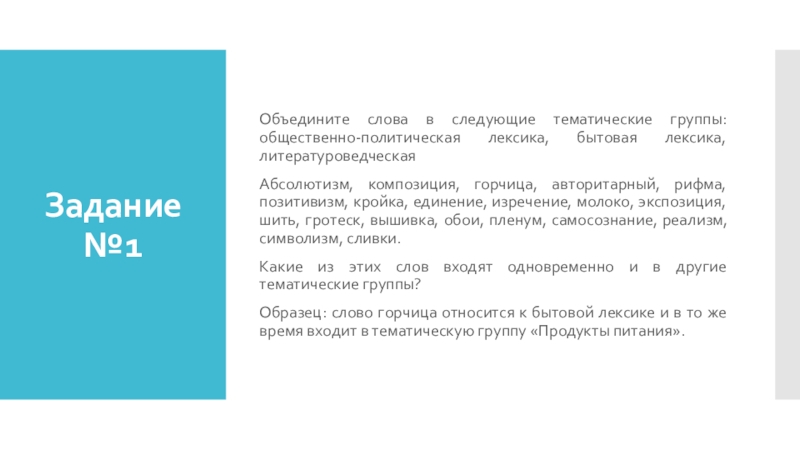 Образец: слово горчица относится к бытовой лексике и в то же время входит в тематическую группу «Продукты питания».