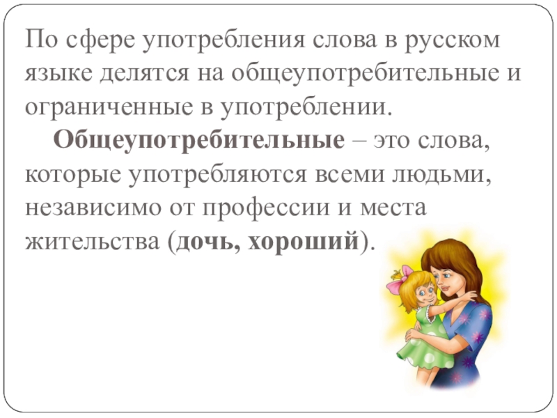Общеупотребительные – это слова, которые употребляются всеми людьми, независимо от профессии и места жительства (дочь, хороший).