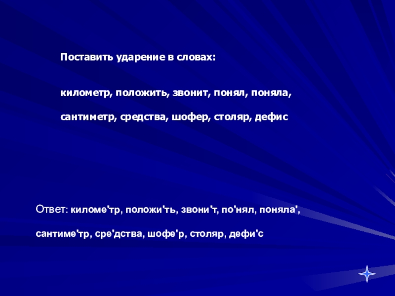 Ответ: киломе'тр, положи'ть, звони'т, по'нял, поняла',