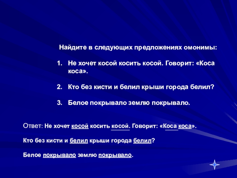Ответ: Не хочет косой косить косой. Говорит: «Коса коса».