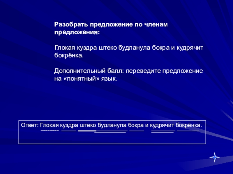 Ответ: Глокая куздра штеко будланула бокра и кудрячит бокрёнка.