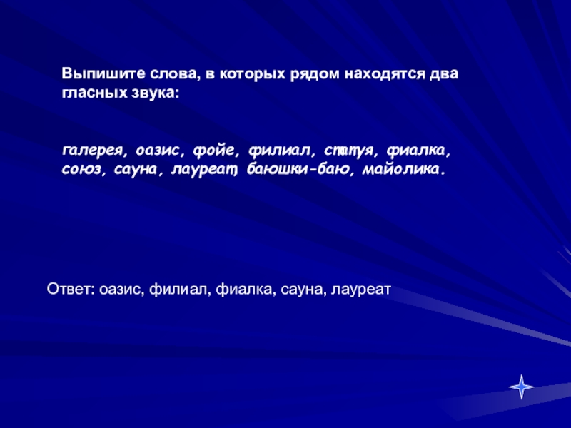 Ответ: оазис, филиал, фиалка, сауна, лауреат