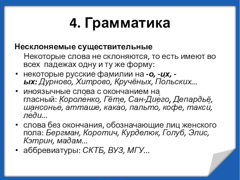 некоторые русские фамилии на -о, -их, -ых: Дурново́, Хитрово́, Кручёных, По́льских...