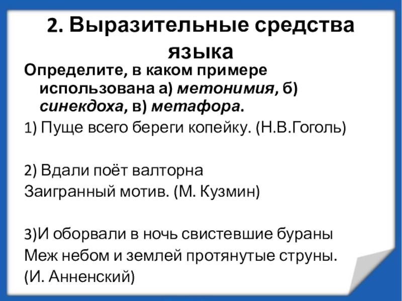 Синекдоха – вид тропа; употребление названия части вместо целого и наоборот: белеет парус одинокий (вместо: лодка, корабль).