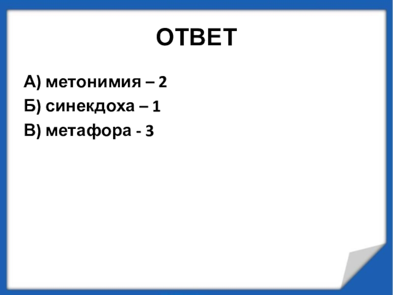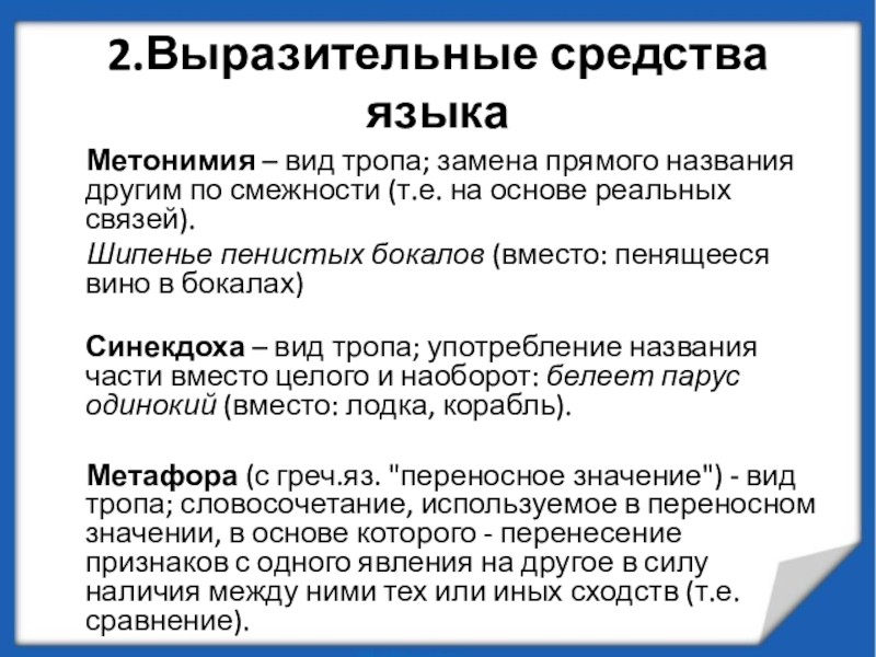 Метафора (с греч.яз. "переносное значение") - вид тропа; словосочетание, используемое в переносном значении, в основе которого - перенесение признаков с одного явления на другое в силу наличия между ними тех или иных сходств (т.е. сравнение).