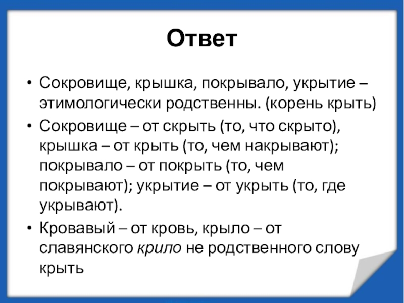 Сокровище, крышка, покрывало, укрытие – этимологически родственны. (корень крыть)