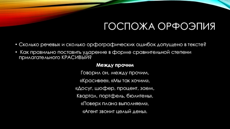 Госпожа орфоэпияСколько речевых и сколько орфографических ошибок допущено в тексте? Как правильно поставить ударение в форме сравнительной