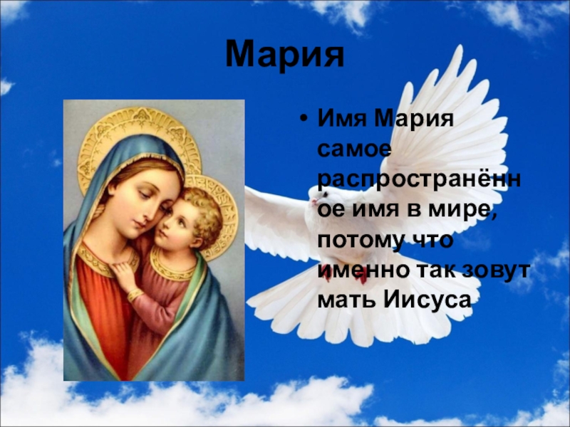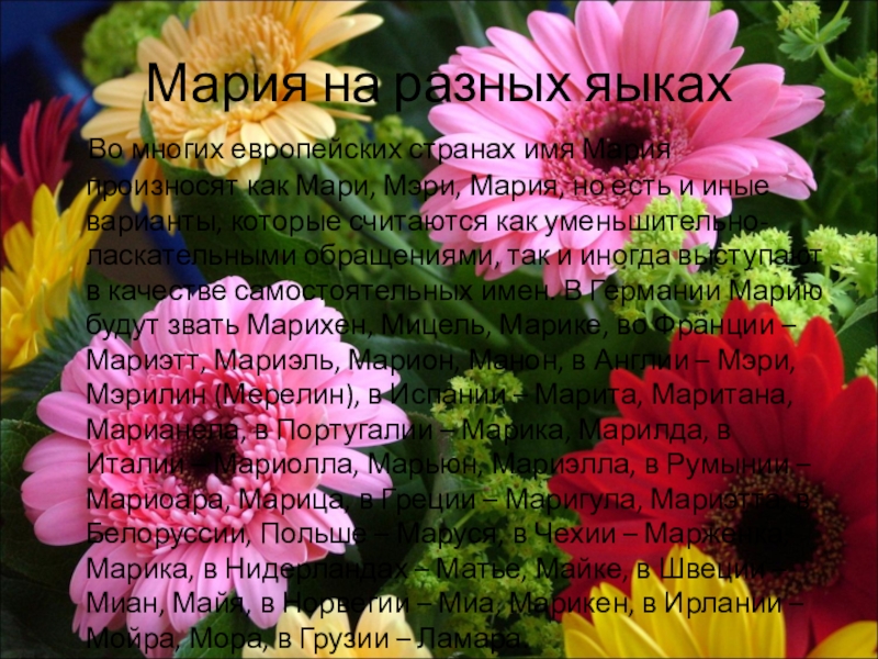 произносят как Мари, Мэри, Мария, но есть и иные варианты, которые считаются как уменьшительно-ласкательными обращениями, так и иногда выступают в качестве самостоятельных имен. В Германии Марию будут звать Марихен, Мицель, Марике, во Франции – Мариэтт, Мариэль, Марион, Манон, в Англии – Мэри, Мэрилин (Мерелин), в Испании – Марита, Маритана, Марианела, в Португалии – Марика, Марилда, в Италии – Мариолла, Марьюн, Мариэлла, в Румынии – Мариоара, Марица, в Греции – Маригула, Мариэтта, в Белоруссии, Польше – Маруся, в Чехии – Марженка, Марика, в Нидерландах – Матье, Майке, в Швеции – Миан, Майя, в Норвегии – Миа, Марикен, в Ирлании – Мойра, Мора, в Грузии – Ламара.