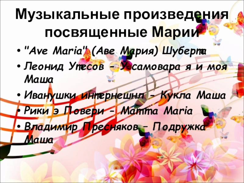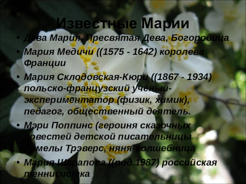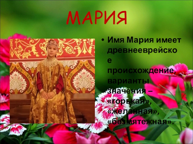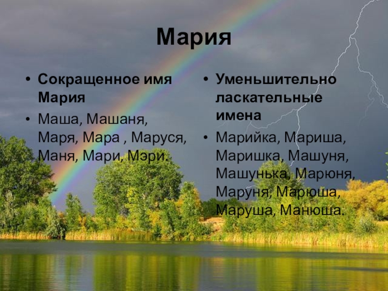 Маша, Машаня, Маря, Мара , Маруся, Маня, Мари, Мэри.
