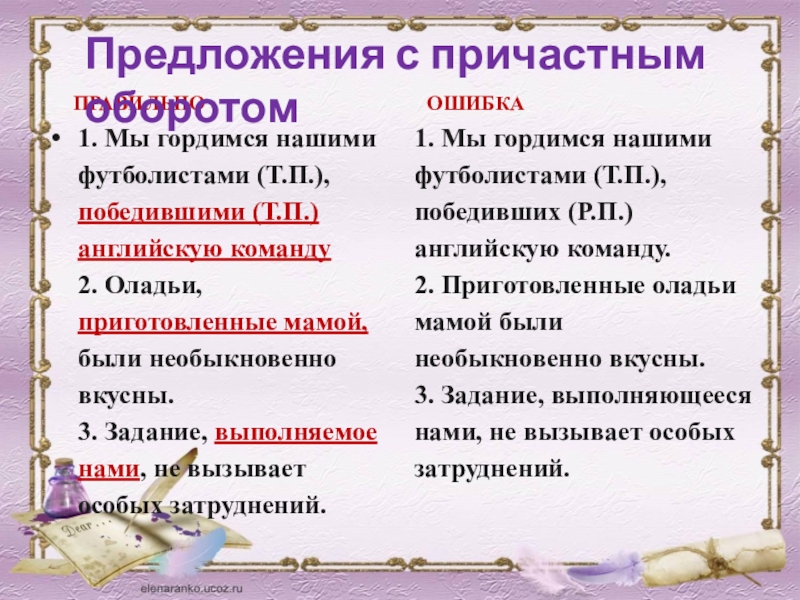 1. Мы гордимся нашими футболистами (Т.П.), победивших (Р.П.) английскую команду.