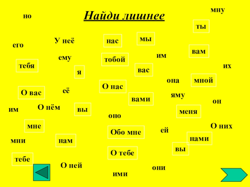 Найди лишнееегоУ неёнасмывывасвамивамО васяменямноймнеОбо мненамнамиО настытебятобойтебеО тебевыонемуО нёмимоноонаеёейО нейониихимО нихиминомнумнияму