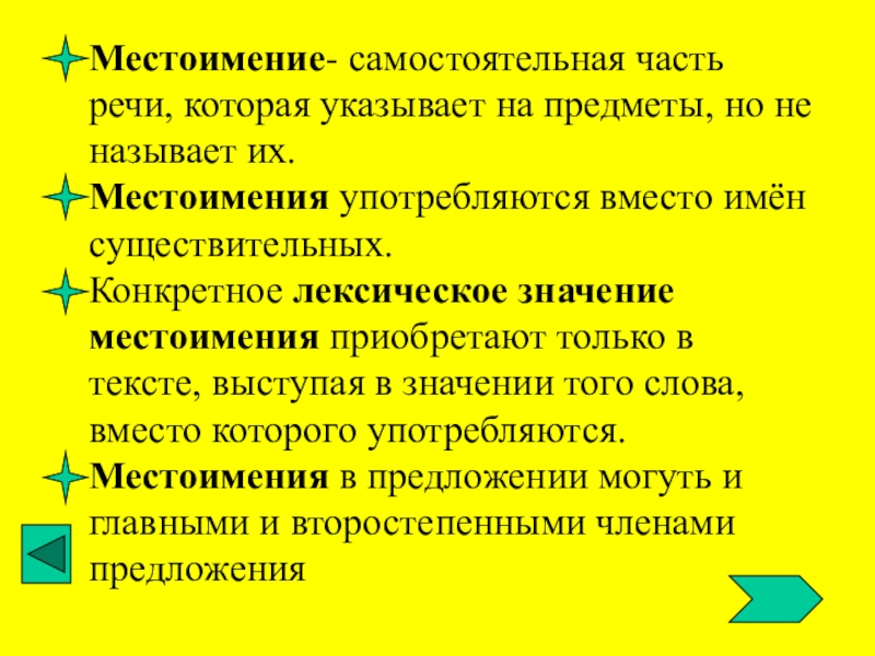 Местоимение- самостоятельная часть речи, которая указывает на предметы, но не называет их.Местоимения употребляются вместо имён существительных.Конкретное лексическое