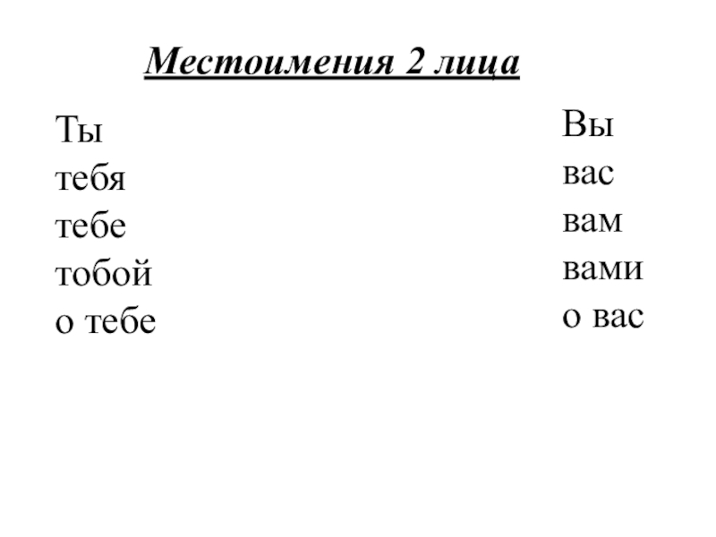 Местоимения 2 лицаТытебятебетобойо тебеВывасвамвамио вас