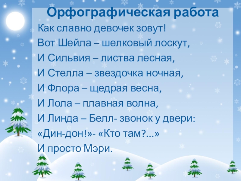 Орфографическая работа Как славно девочек зовут!Вот Шейла – шелковый лоскут,И Сильвия – листва лесная,И Стелла – звездочка