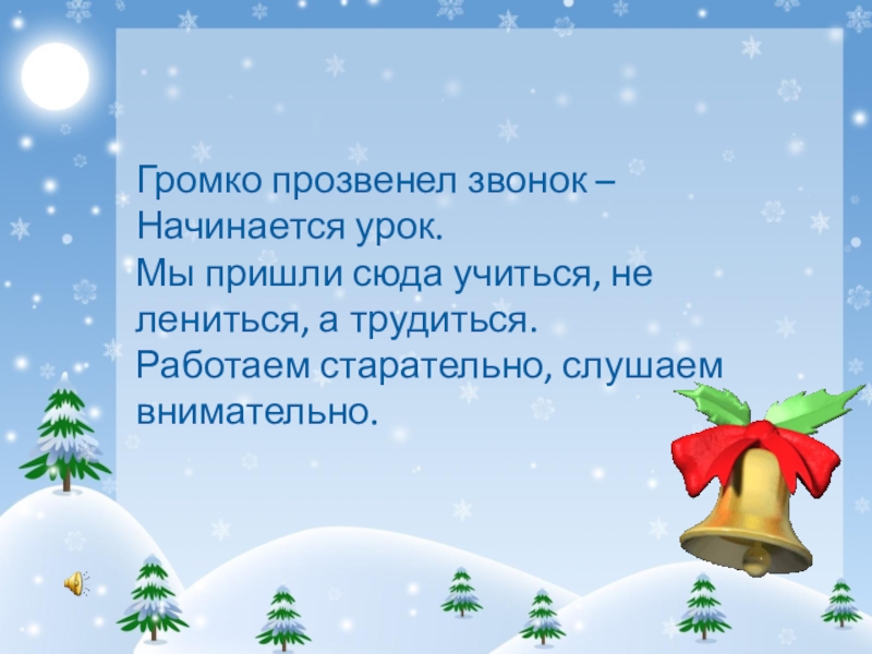 Громко прозвенел звонок – Начинается урок. Мы пришли сюда учиться, не лениться, а трудиться. Работаем старательно, слушаем внимательно.