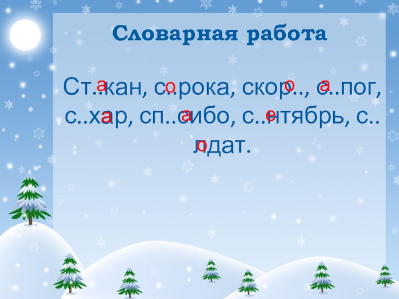 Словарная работаСт..кан, с..рока, скор.., с..пог, с..хар, сп..сибо, с..нтябрь, с..лдат.аооаааое