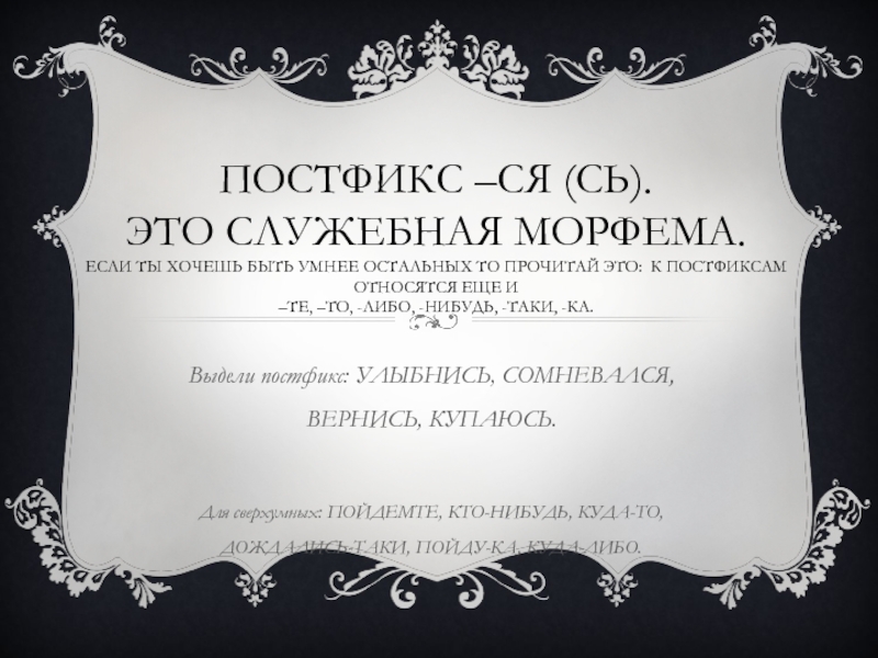 Выдели постфикс: УЛЫБНИСЬ, СОМНЕВАЛСЯ, ВЕРНИСЬ, КУПАЮСЬ.
