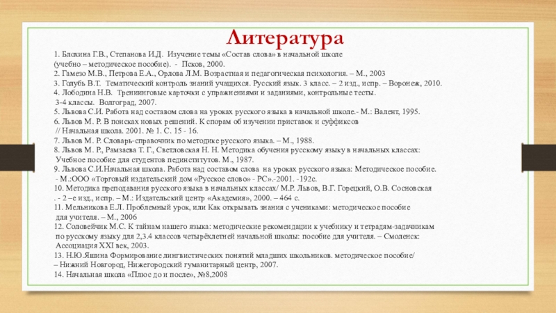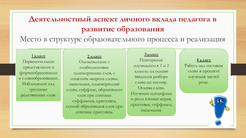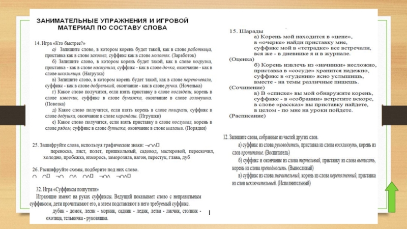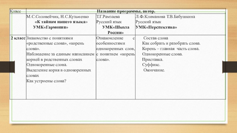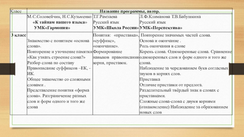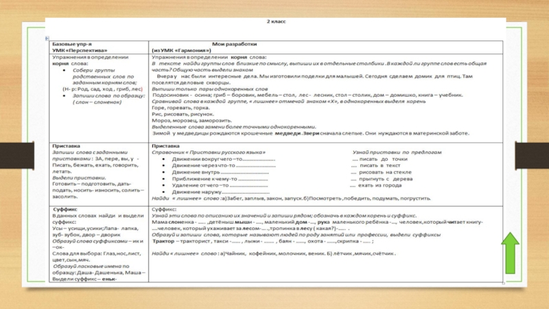 Ознакомление с особенностями однокоренных слов, с понятием «корень слова», окончание, однокоренные слова, суффикс, образование слов при помощи суффиксов, приставок, способ образования слов при помощи приставок.