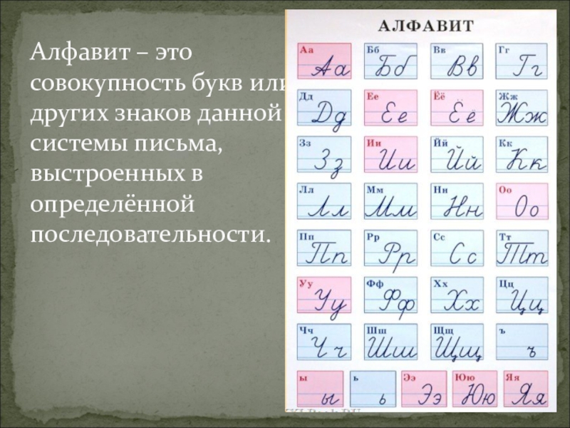 Слайд 3Алфавит – это совокупность букв или других знаков данной системы письма,