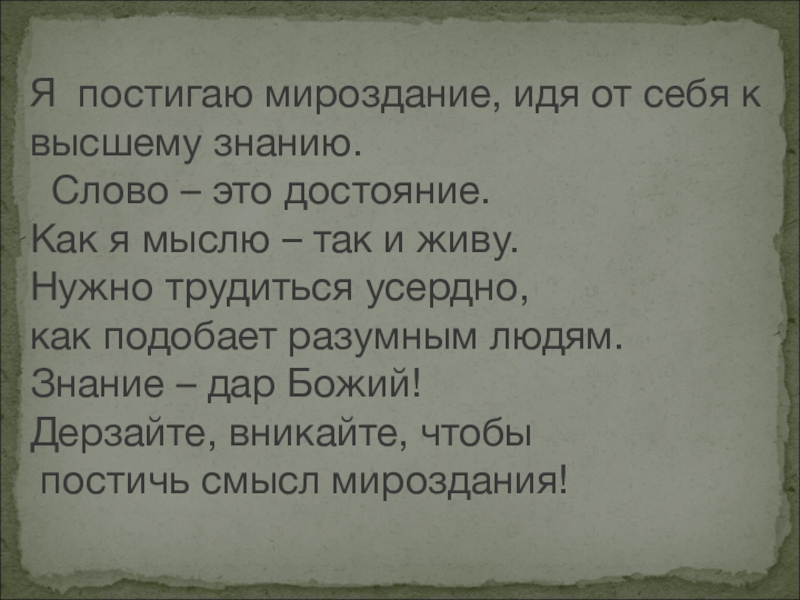 Слайд 9Я постигаю мироздание, идя от себя к высшему знанию.