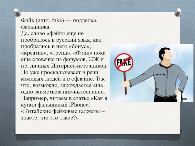 Слайд 23Фэйк (англ. fake) — подделка, фальшивка.