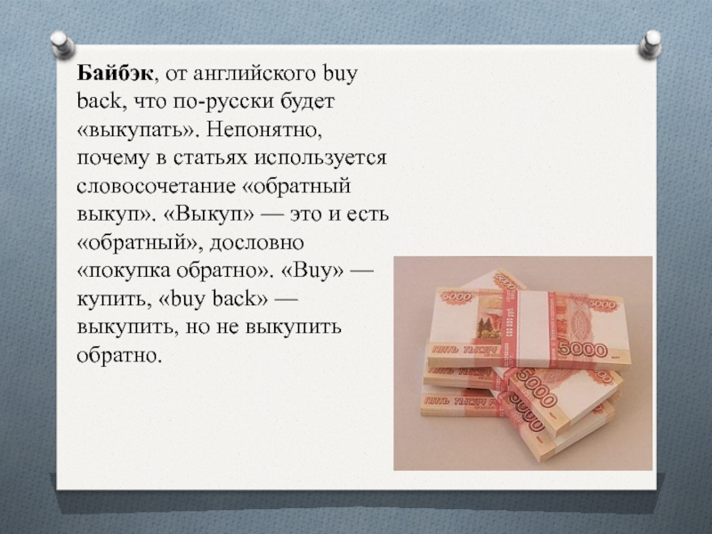Слайд 19Байбэк, от английского buy back, что по-русски будет «выкупать». Непонятно, почему