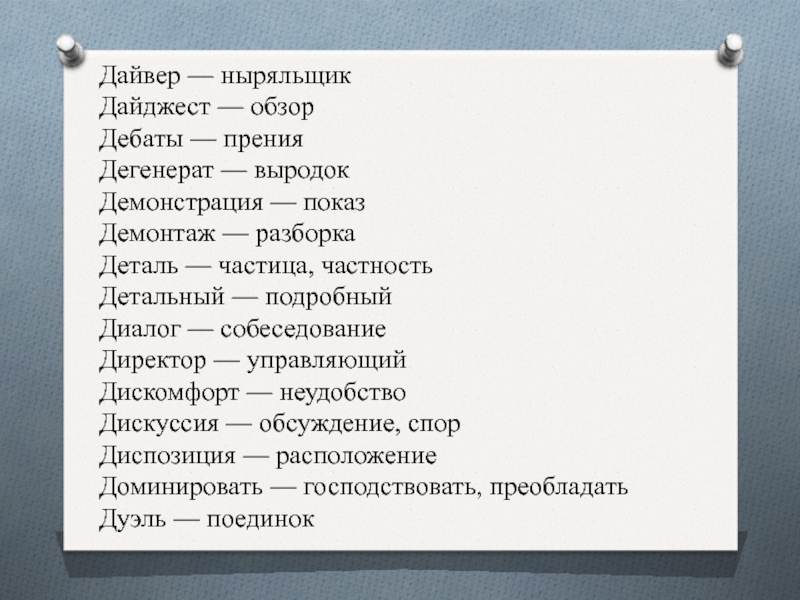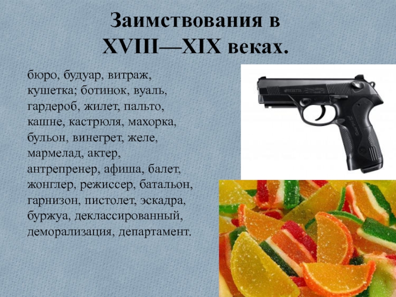 пальто, кашне, кастрюля, махорка, бульон, винегрет, желе, мармелад, актер, антрепренер, афиша, балет, жонглер, режиссер, батальон, гарнизон, пистолет, эскадра, буржуа, деклассированный, деморализация, департамент.